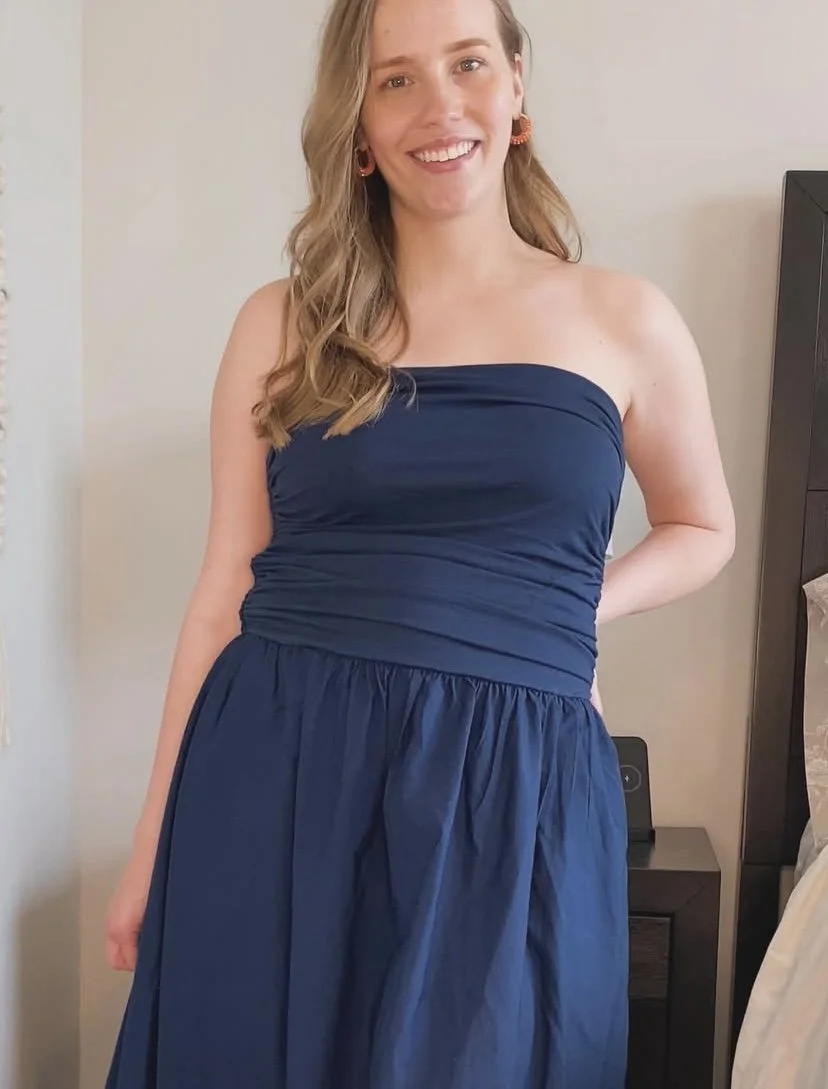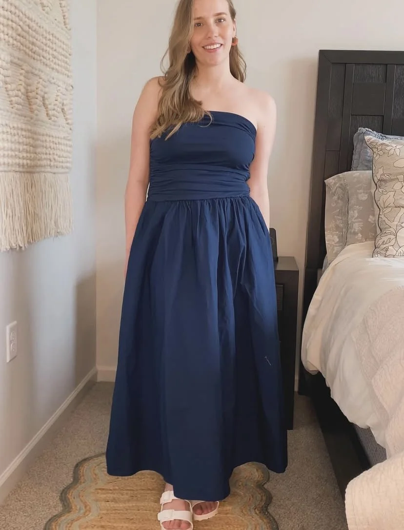 What I love most is how the dress gives off a “mama power” energy—it quietly commands attention with its simple, structured silhouette. Made from lightweight, breathable fabric and, yes, it has pockets—this dress easily shifts from casual to elevated depending on your footwear.