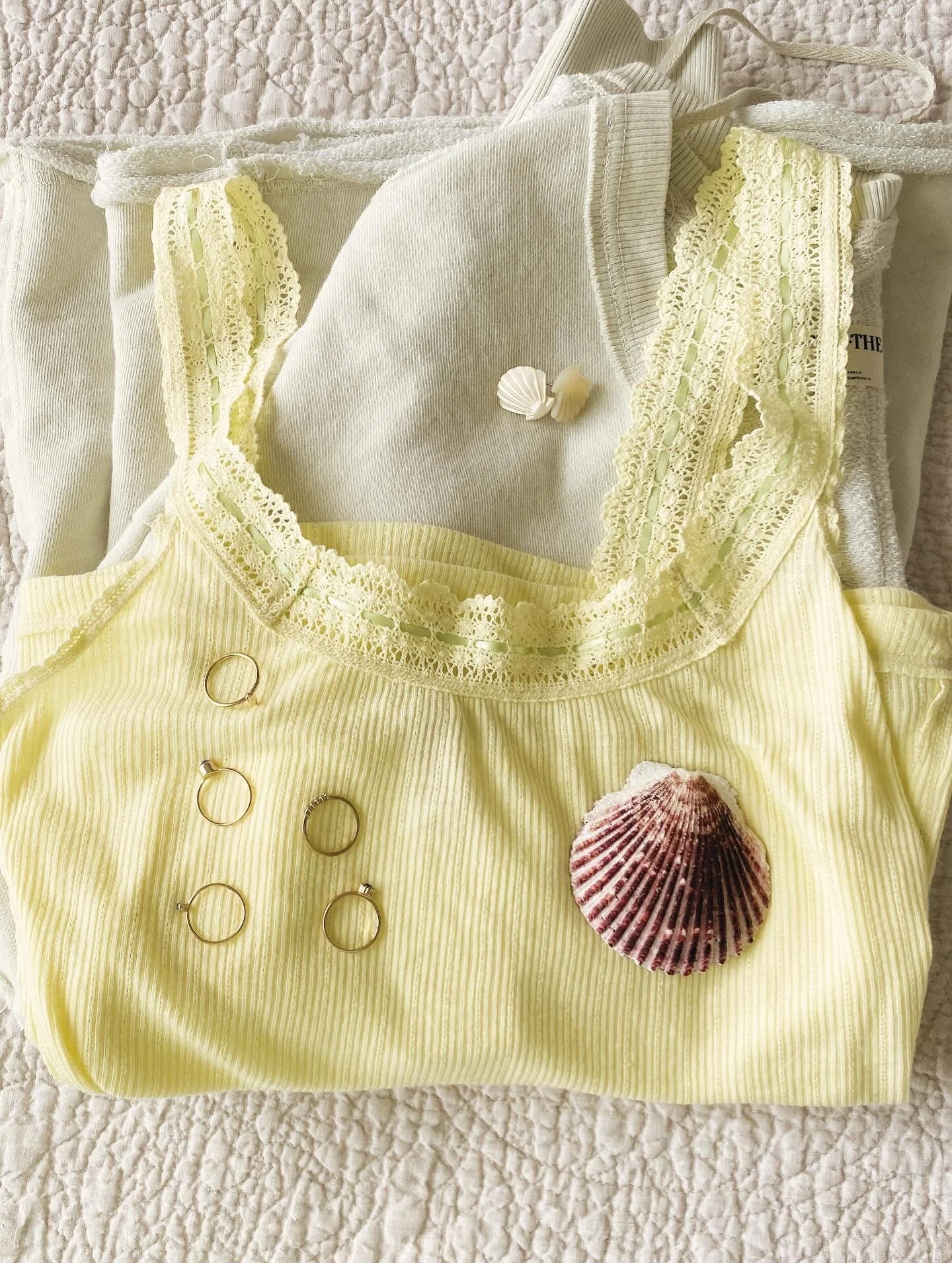 Now, layer on an oversized beige sweatshirt, worn slightly off one shoulder. This styling detail makes all the difference: it reveals a peek of what’s underneath—a delicate, yellow lace-trimmed tank top that adds a feminine and unexpected pop of color.
