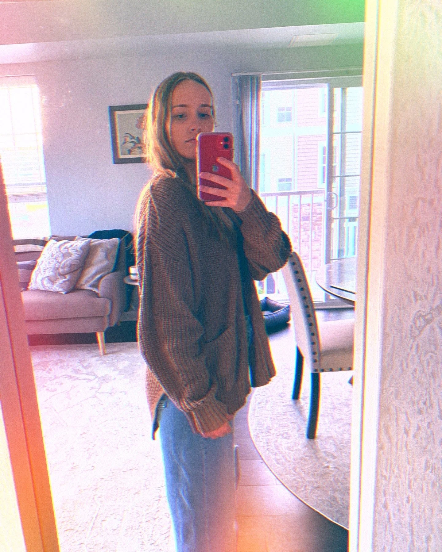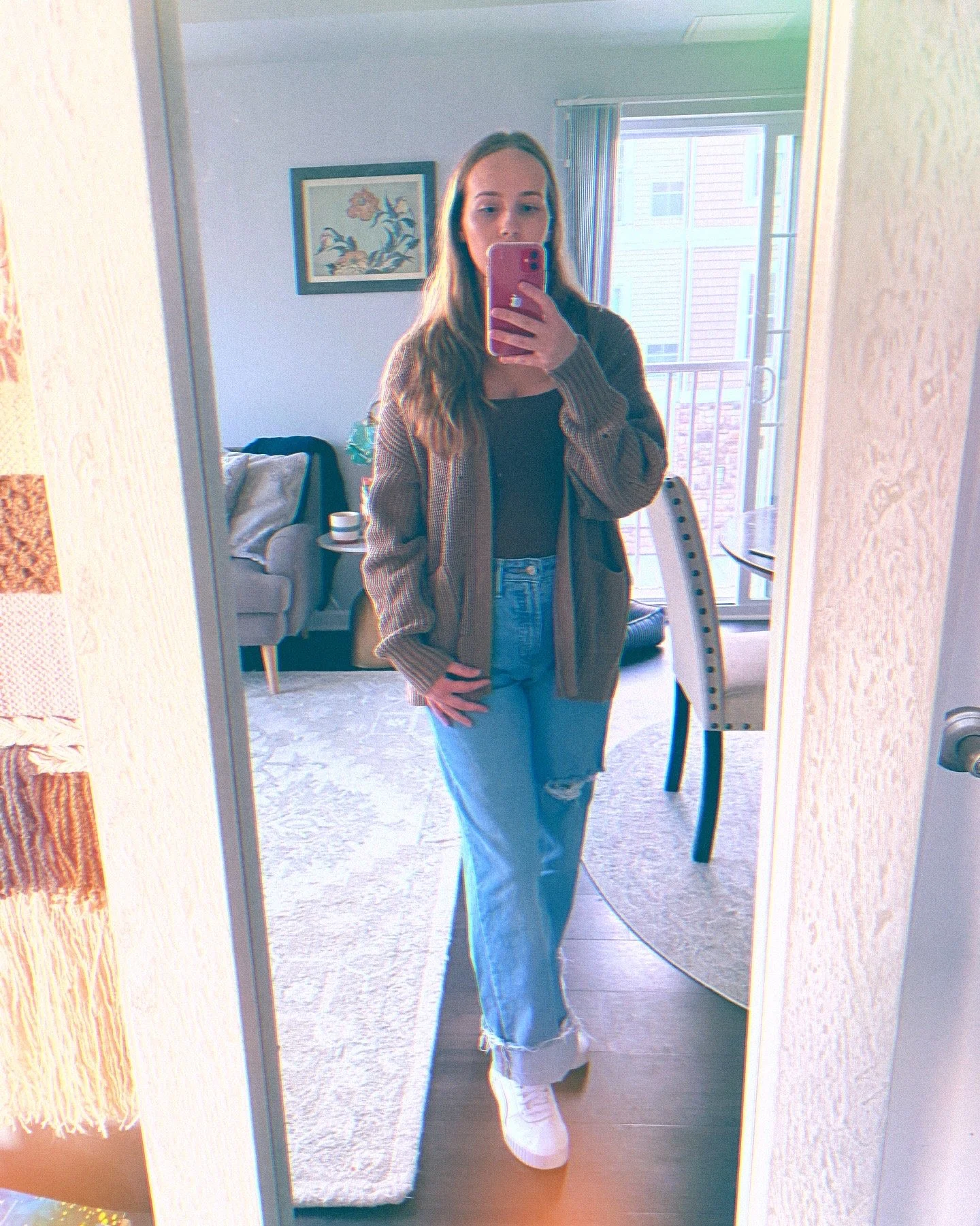Light brown cardigan by American Eagle | Bodysuit by Aerie | Jeans by Old Navy