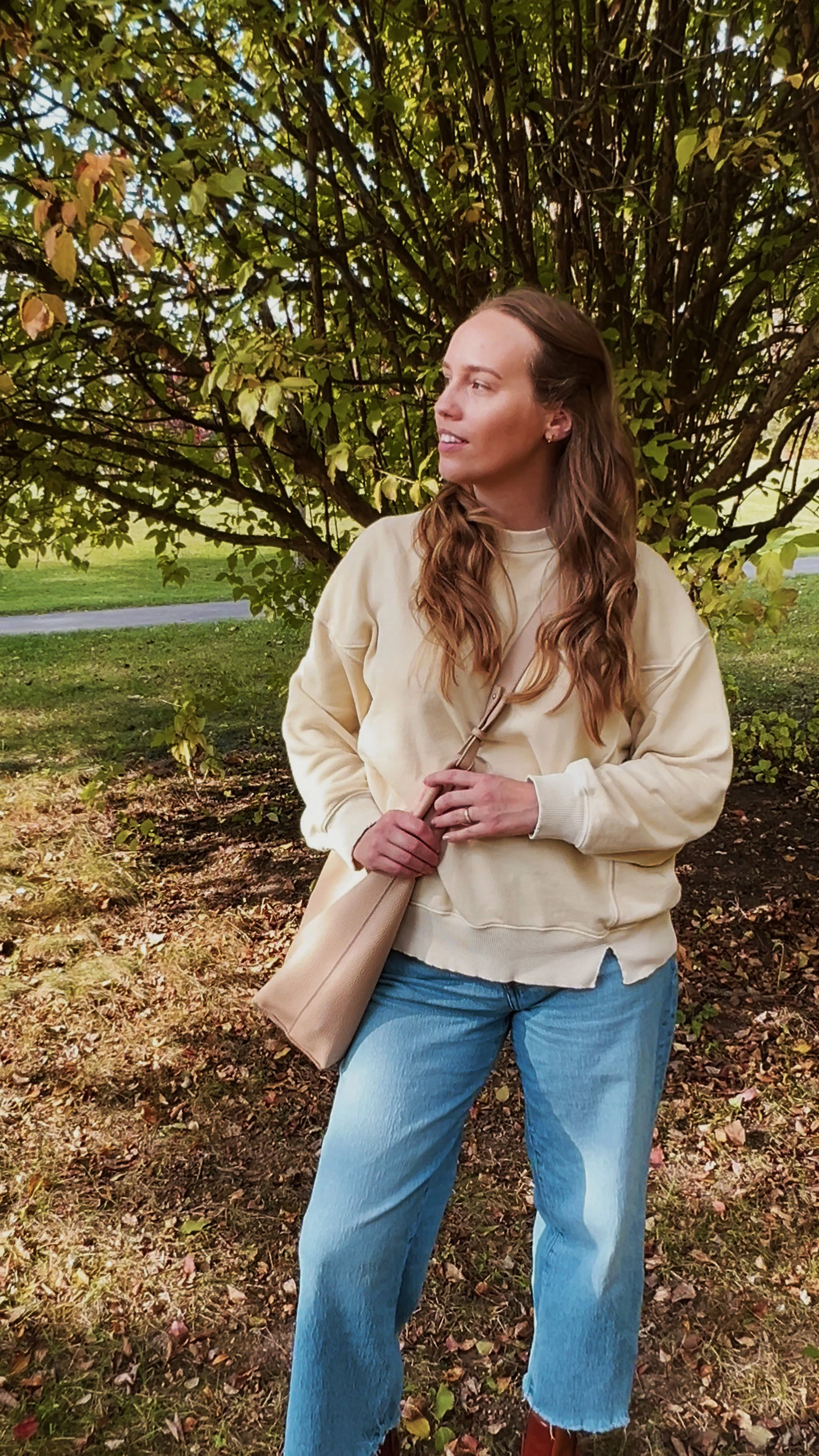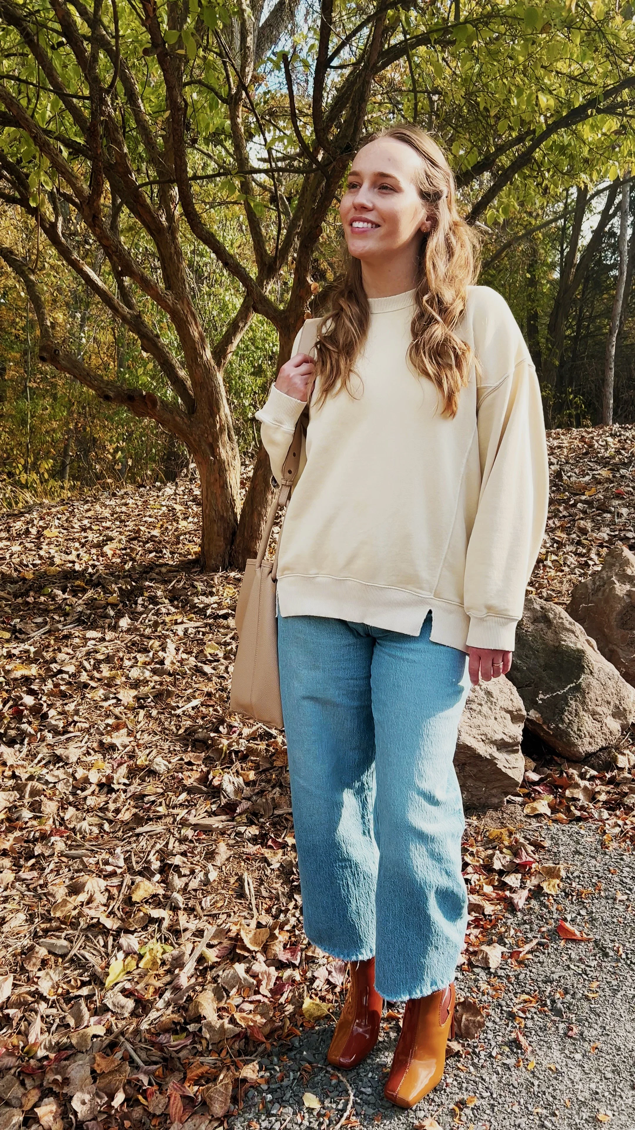 To bring in the cozy element, I layered on my favorite butter yellow oversized sweatshirt. It’s slouchy in all the right ways and adds the perfect pop of soft color, kind of like sunshine on a cloudy fall day.