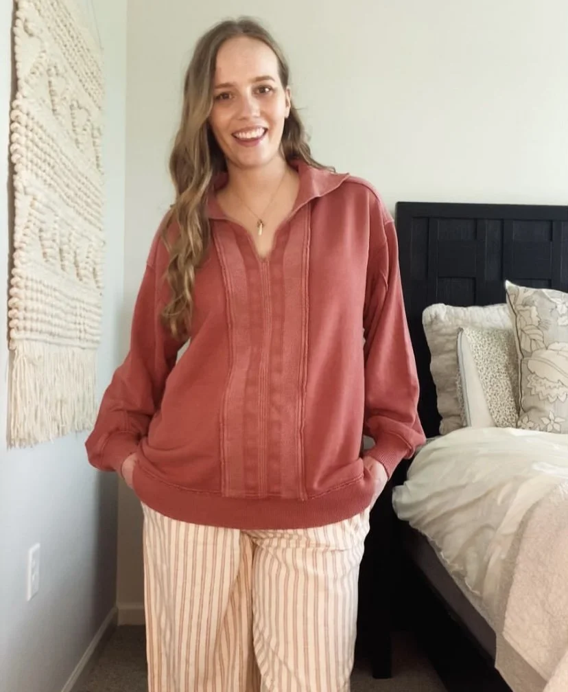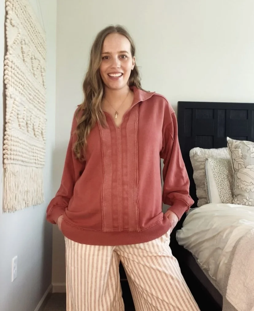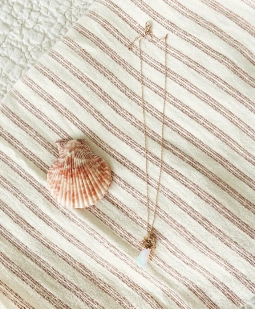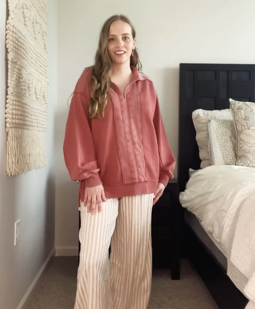To finish the look, I added a delicate flower opal necklace—just the right touch of softness against the bold red. The iridescent shimmer of the opal caught the light in the most subtle way, echoing the creamy tones in the striped trousers and adding a little romantic contrast to the oversized sweatshirt. It grounded the outfit with something organic and a bit whimsical. It’s amazing how one small piece of jewelry can tie everything together, making the whole look feel intentional yet effortlessly undone.