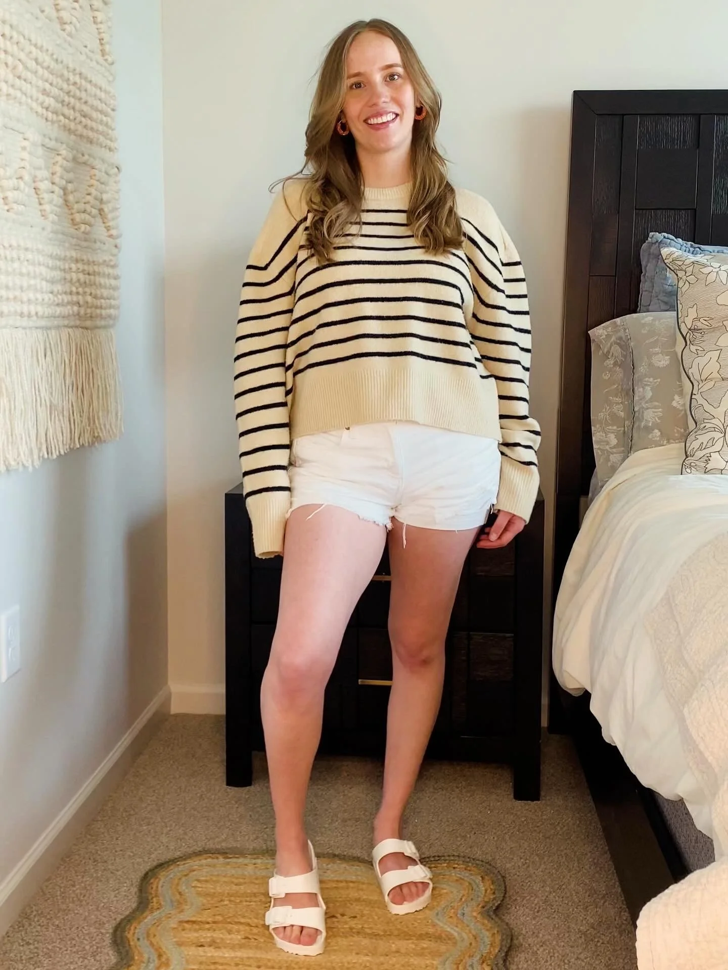 On Friday, right before the weekend kicked off, I got a fresh haircut—and of course, I had to wear something that felt just as fresh. The outfit I threw on was simple but put together: crisp white shorts, a soft striped cashmere sweater, and my go-to Birks.