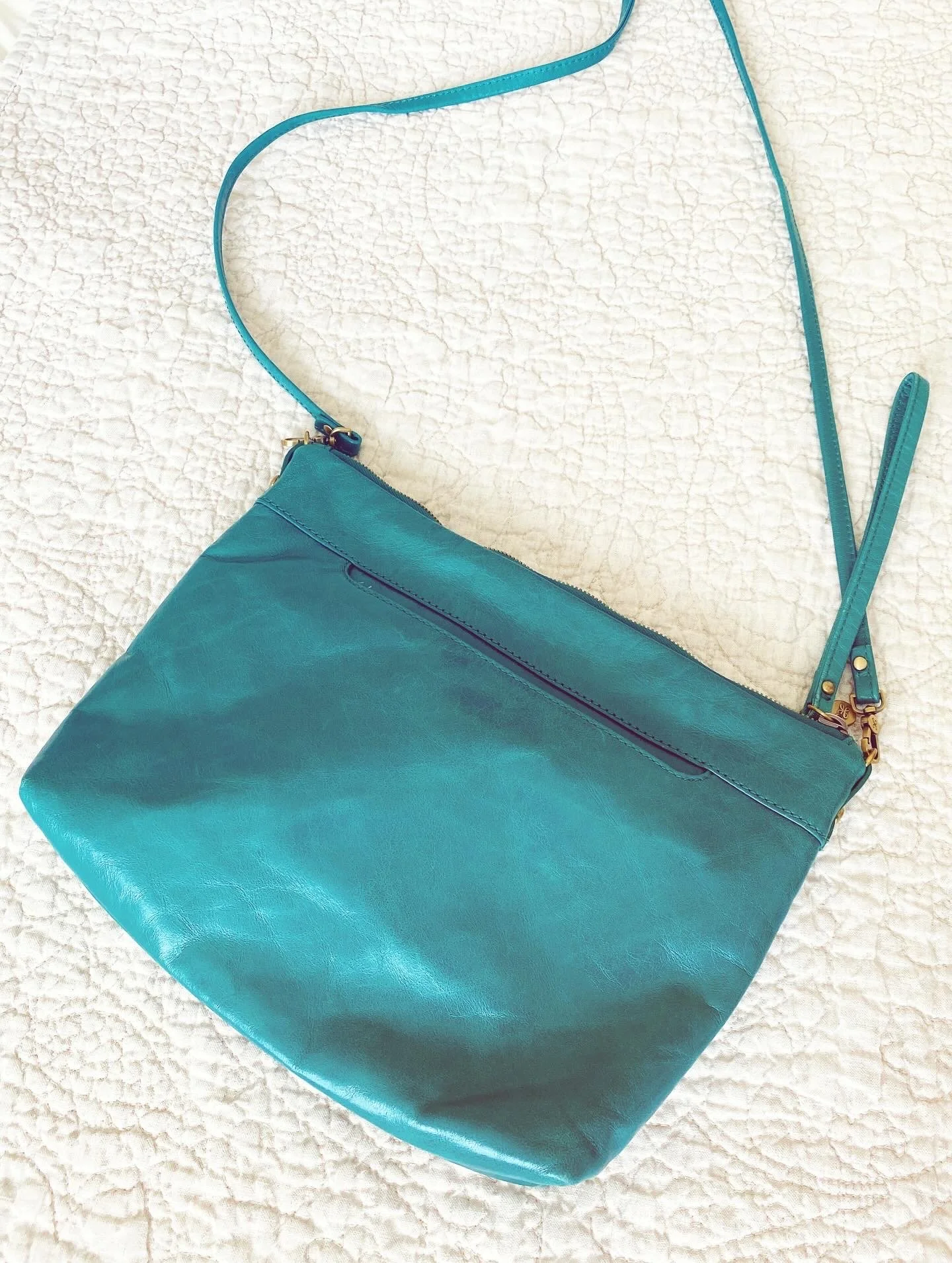And the finishing touch? An emerald leather crossbody bag that pops against the soft mint tones and ties the whole look together. Functional? Yes. But also, a bold little statement all on its own.